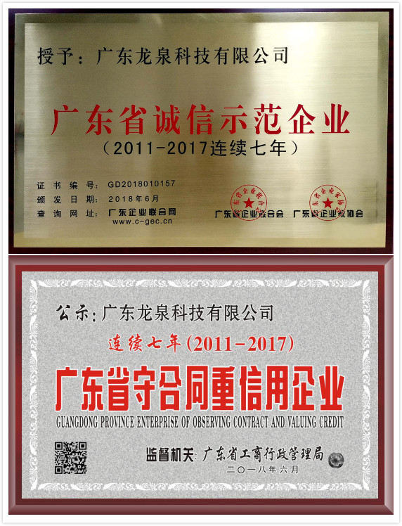 廣東龍泉獲得“廣東省守合同重信用”及“廣東省誠信示范企業(yè)”稱號(hào)